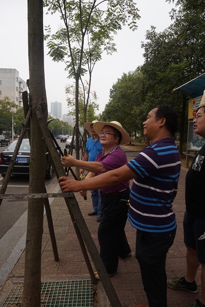 一行人戴着草帽,准备了便携的工具钳,大型的断线钳以及撬棍等专业工具。王文波总经理手持撬棍把树干上残留的铁钉一根根拔除,为了在撬动时不伤到树皮,在撬棍上缠绕棉布,在树干上垫了木板。其他同志也分工明确,对树上的铁丝、绳索、张贴物以及损坏的树撑等进行全面清理。整整一上午,一行人对学苑路、迎宾大道的道路两旁的树木都进行了清理。