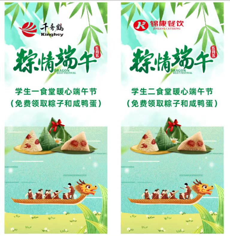 2022年端午节,正值毕业生返校期,加上疫情影响,我校大部分学生留校过节。为了让留校的广大师生感受到节日的氛围和学校对于学生们的关怀,学校后勤处提前安排食堂做易拉宝进行端午节活动宣传,安排食堂所有工作人员端午节当天全员在岗,确保正常供餐,并开展在学生食堂免费发粽子、咸鸭蛋和包子的活动,以回馈广大师生一直以来对学校食堂工作的支持。