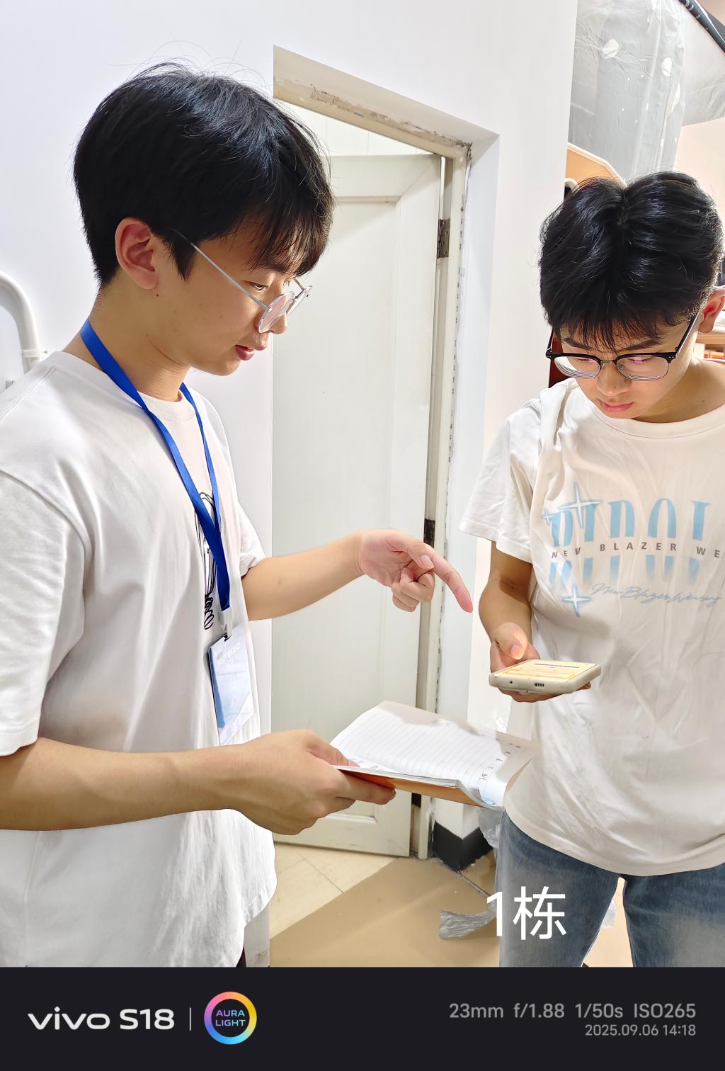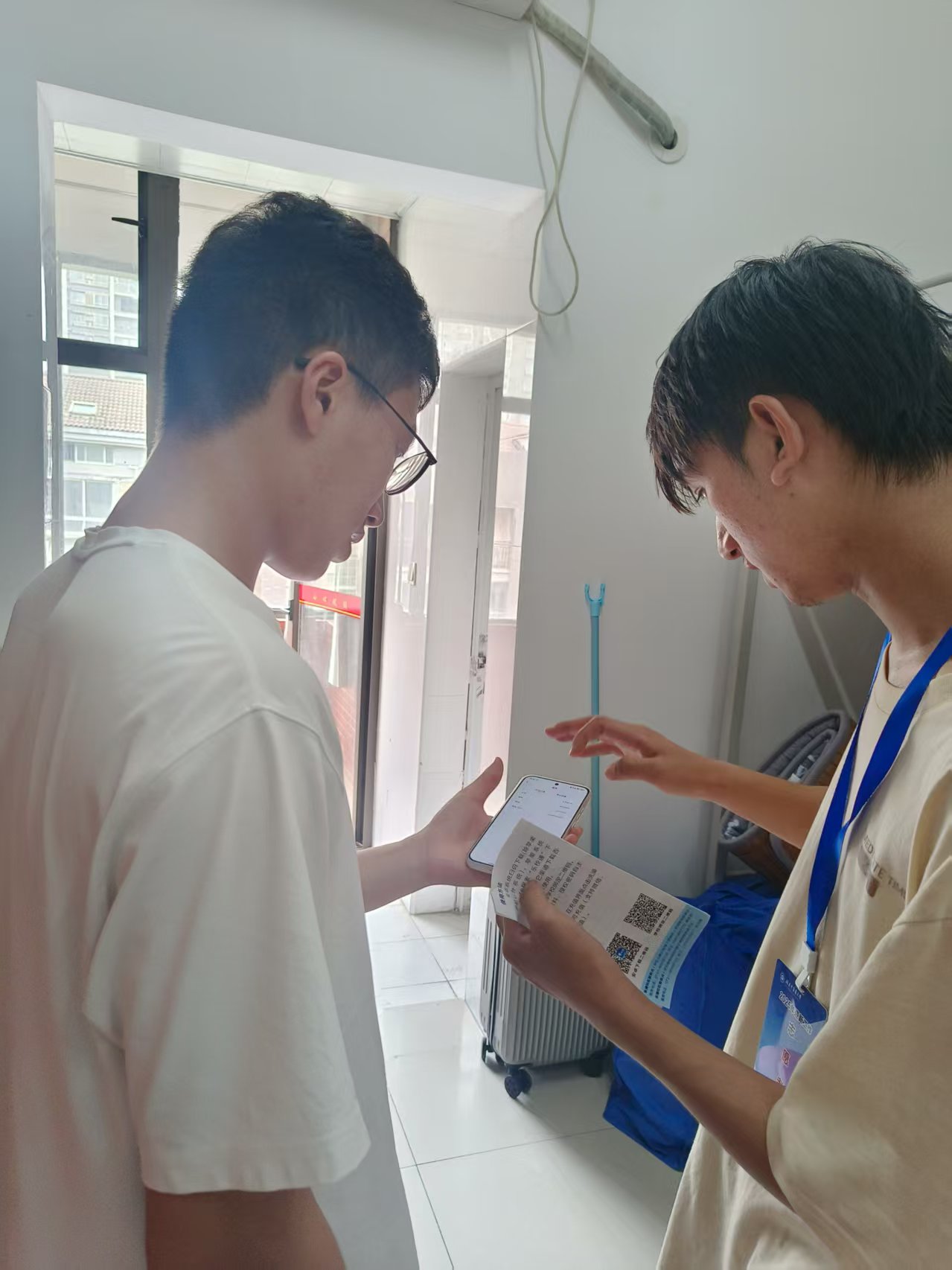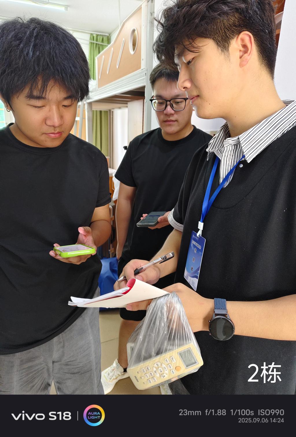 为让新生及家长进入寝室就感到宾至如归,后勤处能源管理特意安排了37名学生志愿者,深入两校区每间新生宿舍,为新同学发放空调遥控器并提供空调调试服务,同时耐心地教新同学们下载乐校通APP,现场演示怎么使用热水和直饮水,还细心排查每间新生房间存在的热水、直饮水以及空调等设施,发现问题第一时间上报并维修处理,全程为新生入学保驾护航,将温暖送至每一位新生。