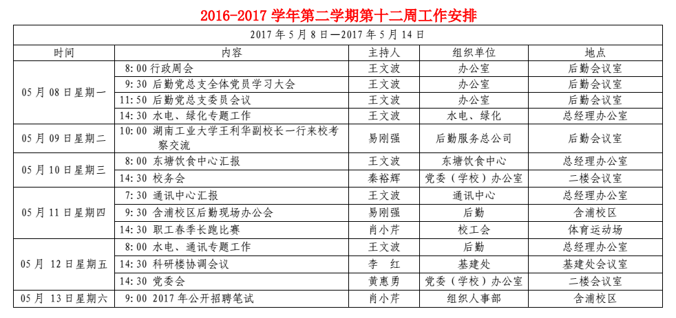 2017学年后勤第十二周工作安排